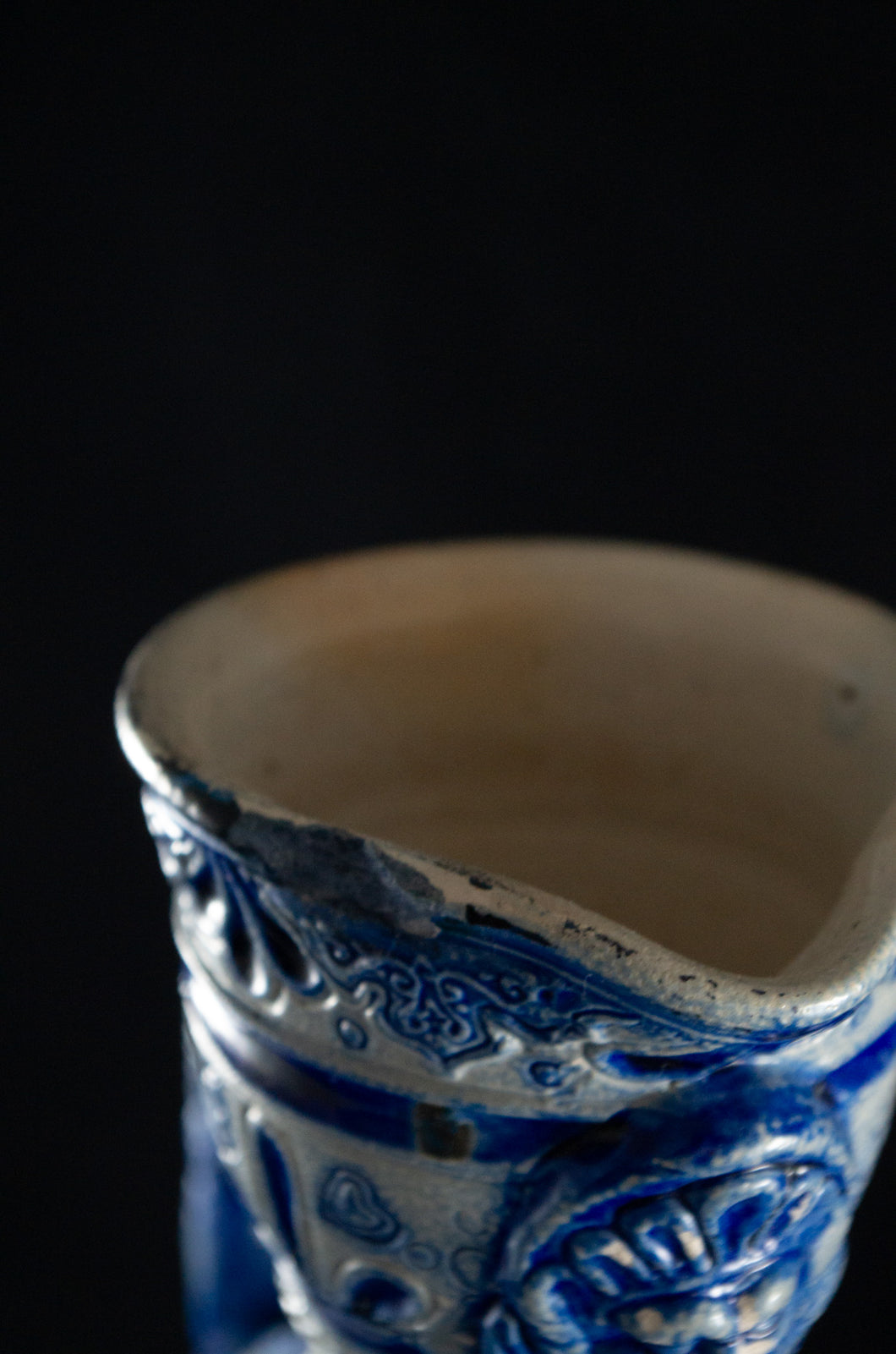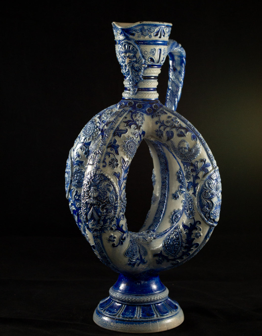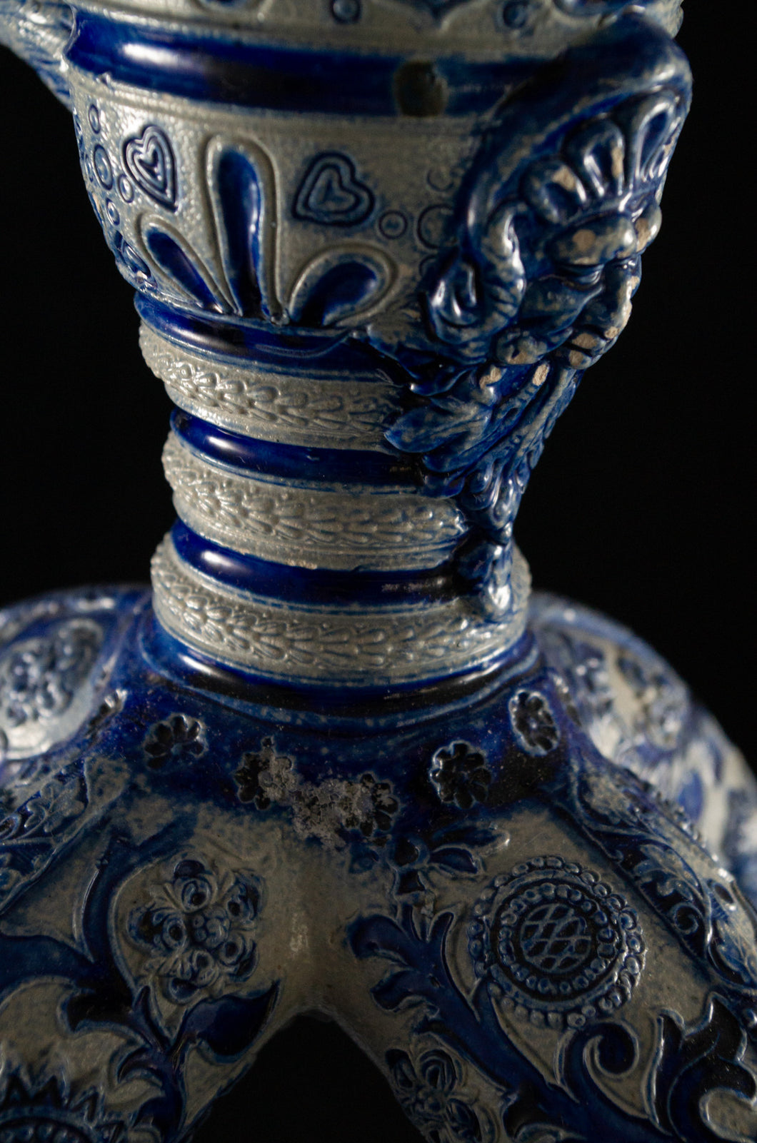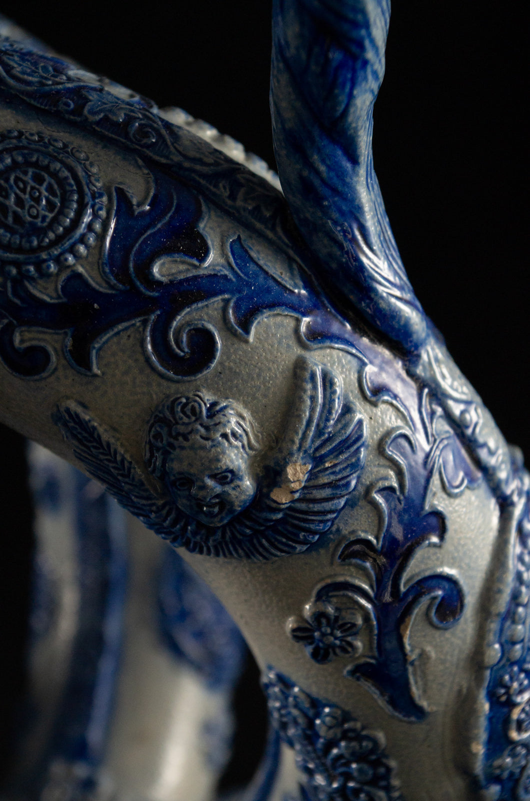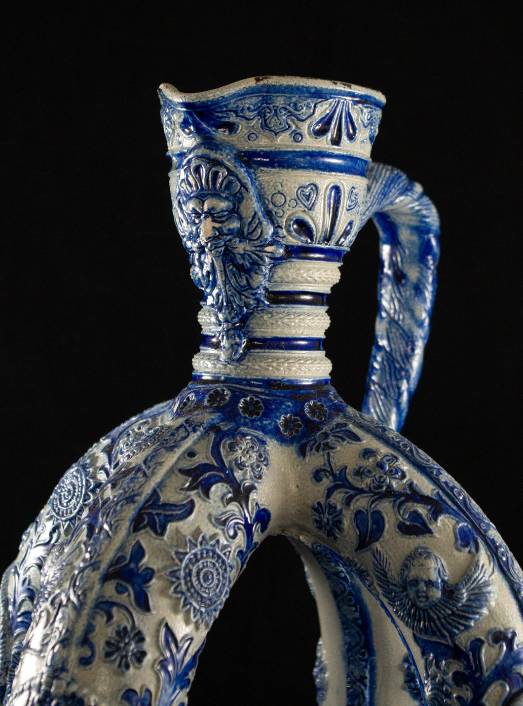 A German Westerwald salt glazed grey and cobalt ewer c.1900. Tall ribbed neck and two intersecting double rings. Embellished with heraldic badges and symbols. Westerwald pottery is from the area of Westerwaldkreis in the Rheinland. Salt glaze has a greyish white surface with a texture like an orange peel. From a private Los Angeles estate.
